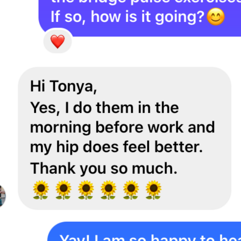 "I signed up for online yoga classes with Tonya that focused on my hips. As a result of a hybrid work-from-home situation, I’ve been sitting more and started having hip problems. Tonya taught me some great exercises that I now do regularly. She makes it easy to follow. I have a crazy schedule, so being able to do an online class was exactly what I needed. I would highly recommend taking a class with Tonya."