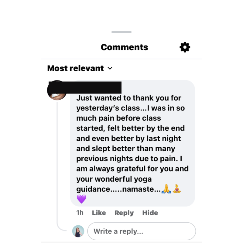 "You have been the one that has made me LOVE my yoga practice and continue on this journey. It has made such a difference in my day-to-day life. I truly am grateful for you!"